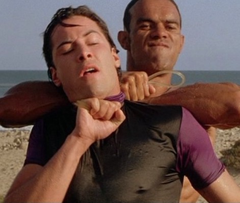 In the movie "Point Break" of 1991 Keanu (age 27 back then) is getting strangled for a short time.